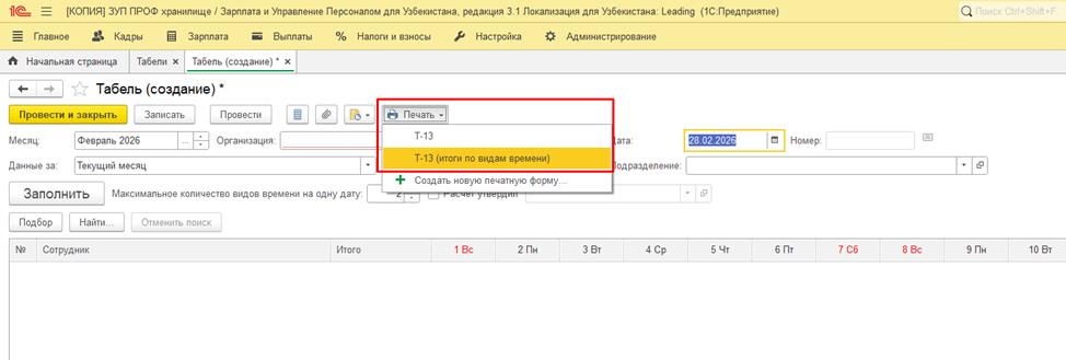 В текущем релизе актуализирована печатная форма табеля учета рабочего времени Т-13.