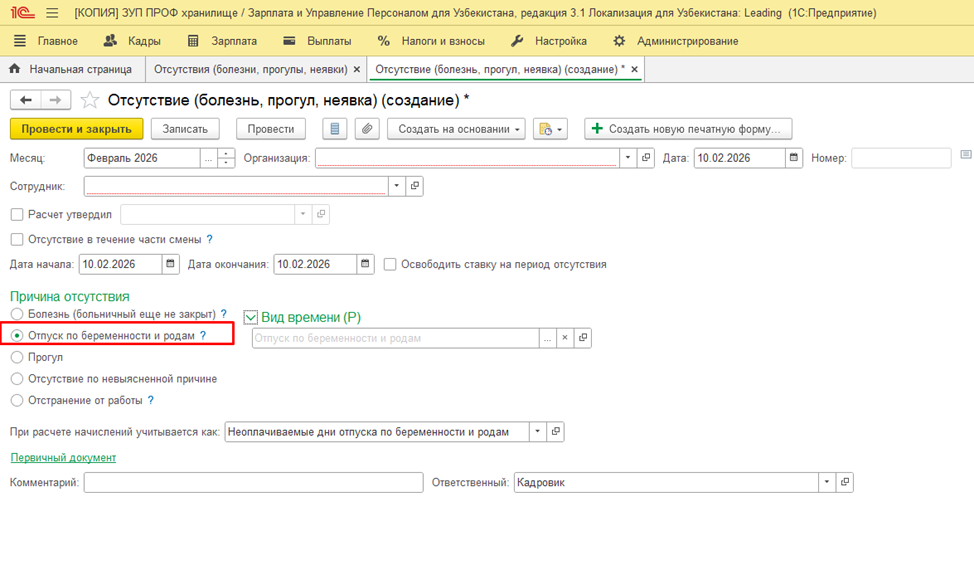 В связи с внесенными изменениями в порядок назначения и выплаты пособия по беременности и родам в рамках государственного социального страхования, вступившими в силу с 01.01.2026г. на основании ПКМ №796 от 17.12.2025г., в документ «Отсутствие (болезнь, прогул, неявка)» добавлена новая причина отсутствия - «Отпуск по беременности и родам», не требующая расчета суммы пособия. При этом сохранена возможность оформления отпуска по беременности и родам через документ «Больничный лист» - для пользователей, ведущих учет суммы пособия, возмещаемой за счет фонда государственного социального страхования. Всю сумму возмещения необходимо указывать в строке «Возмещаемая сумма из бюджета».