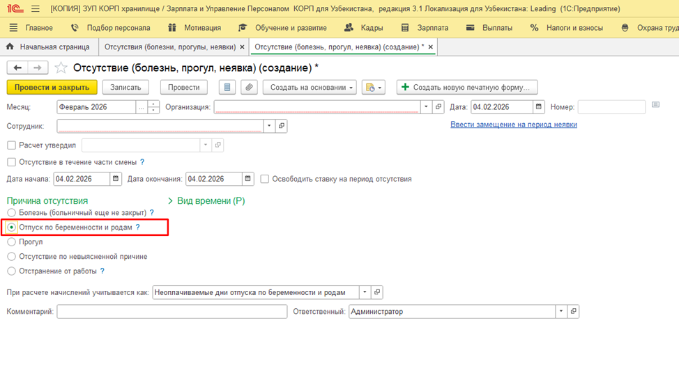 В связи с внесенными изменениями в порядок назначения и выплаты пособия по беременности и родам в рамках государственного социального страхования, вступившими в силу с 01.01.2026г. на основании ПКМ №796 от 17.12.2025г., в документ «Отсутствие (болезнь, прогул, неявка)» добавлена новая причина отсутствия - «Отпуск по беременности и родам», не требующая расчета суммы пособия. При этом сохранена возможность оформления отпуска по беременности и родам через документ «Больничный лист» - для пользователей, ведущих учет суммы пособия, возмещаемой за счет фонда государственного социального страхования. Всю сумму возмещения необходимо указывать в строке «Возмещаемая сумма из бюджета».