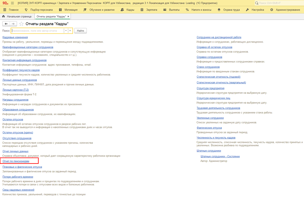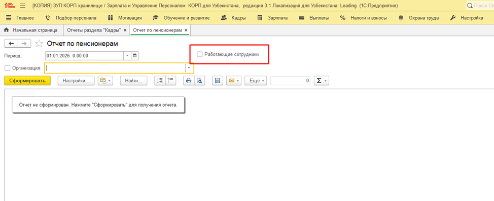 В кадровый отчет «Отчет по пенсионерам» добавлен отбор «Работающие пенсионеры» для формирования данных только по работающим сотрудникам-пенсионерам на определенную дату.