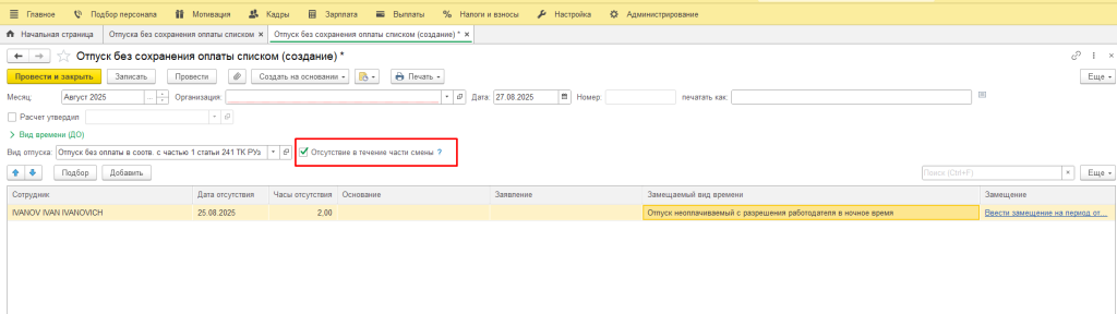 Разработан новый механизм в документе «Отпуск без сохранения оплаты списком». С текущего релиза добавлена возможность оформить отсутствие в части смены на список сотрудников.
