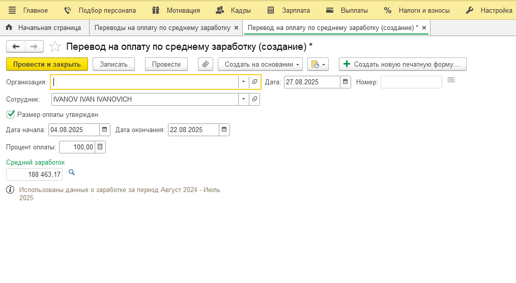 Доработан документ «Перевод на оплату по среднему заработку». С текущего релиза расчет отработанных дней за период указанного в документе будет производиться по среднему заработку согласно № ЗРУ – 1030 от 13.02.2025г.