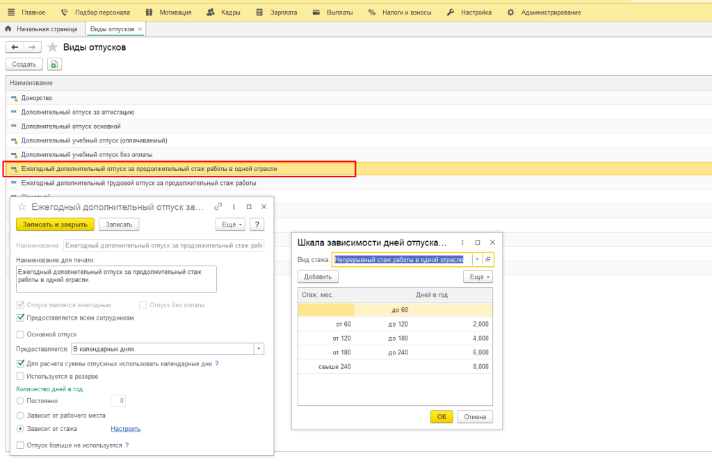 Добавлен новый вид отпуска «Ежегодный дополнительный отпуск за продолжительный стаж работы в одной отрасли».