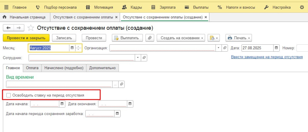 В новом релизе разработан функционал освобождение ставки на период отсутствия в документе «Отсутствие с сохранением оплаты». Для использования данного функционала необходимо установить флаг «Освободить ставку на период отсутствия» в документе.